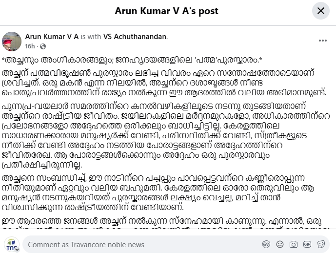 തങ്ങൾ പുരസ്കാരത്തിൽ സന്തുഷ്ടരാണെന്ന് വിഎസിന്റെ മകൻ വി.എ. അരുൺകുമാർ ഫേസ്ബുക്കിലൂടെ പ്രതികരിച്ചു. ആരോഗ്യപരമായ കാരണങ്ങളാൽ വിശ്രമത്തിൽ കഴിയുന്ന വിഎസിന് ലഭിച്ച ഈ അംഗീകാരം കേരളത്തിലെ ജനങ്ങൾക്കുള്ള അംഗീകാരം കൂടിയാണെന്ന് രാഷ്ട്രീയ നിരീക്ഷകർ വിലയിരുത്തുന്നു.